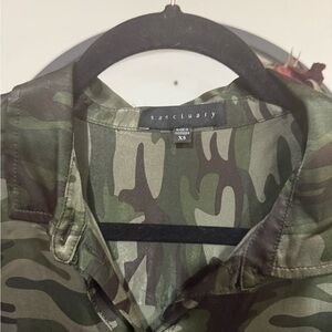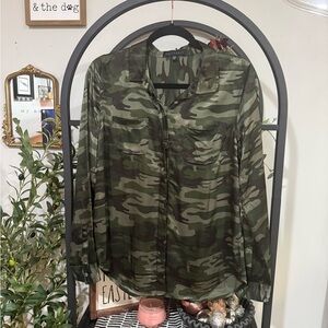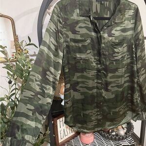 This Sanctuary blouse features a striking green camouflage pattern, crafted from a lightweight fabric for a relaxed fit. Its long sleeves and collared neckline make it a versatile choice for casual wear. The cohesive design ensures a stylish and eye-catching appearance.