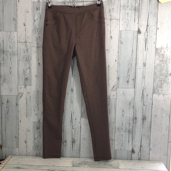Brown, gray and black, faux pockets, rivets on side near pockets, seam behind the knee,colors may vary due to lighting,EUC, Size: S