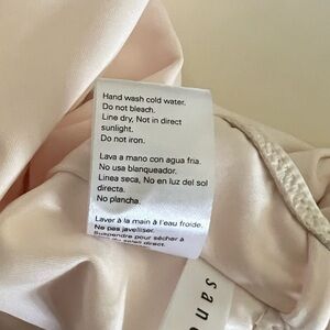 85% recycled Polyester, 15% Spandex. Hand wash cold. Line dry.