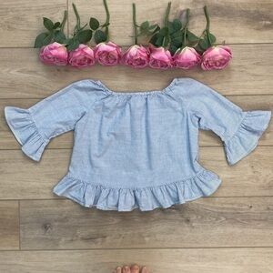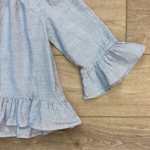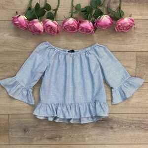 Feminine and lightweight cropped shirred ruffle off the shoulder blouse by Sactuary for Revolve. This seersucker type banker stripe gives a classic and preppy foundation to a relaxed fit off the shoulder shirt with a boho vibe. Size XS
