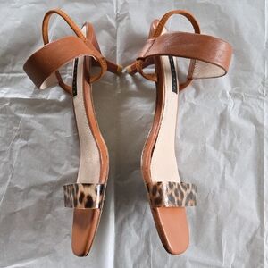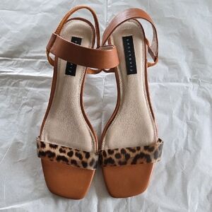Anthropologie Sanctuary "Limbo" leather kitten heel leather leopard print sandals. Brown leather heeled sandals with elastic leather ankle strap Heel Height 1.7" Cute stylish shoes! Leopard animal print strap across toes No Box. Great used condition with minor wear.