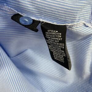 • Features: Long sleeve, Button up front, Buttons at cuffs, Collared, Front patch pocket, Bright light blue with thin white striped pattern, 100% Cotton, Puff sleeves, Oversized relaxed fit