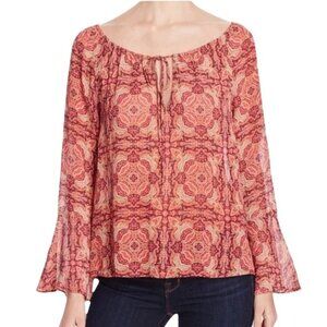 Sanctuary Lyric top in soft crepe rayon has a pink medallion print, bell sleeves, and a relaxed boho fit. Versatile peasant blouse that pairs easily with jeans, skirts, or shorts for everyday wear, office-casual looks, concerts, or festival outfits, women's size S.