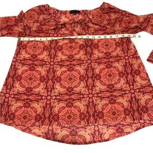 Sanctuary Lyric Top size S in a pink medallion print with flowy bell sleeves and a relaxed silhouette. Lightweight crepe rayon is breathable and comfortable; easy to style with jeans, skirts, or shorts for casual, office-casual, or festival outfits.