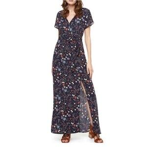 Sanctuary Maxi Dress Womens Large Navy Blue Floral Butterfly Print A Line NEW. Measurements in photos. Final measurement is pit to hemline. Split hem, removable belt/sash, short sleeve, lined, v-neck. Fast shipping!