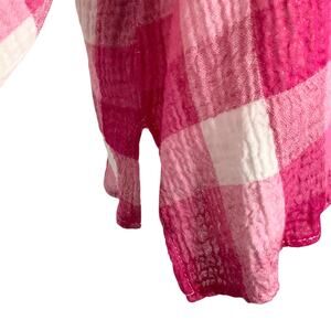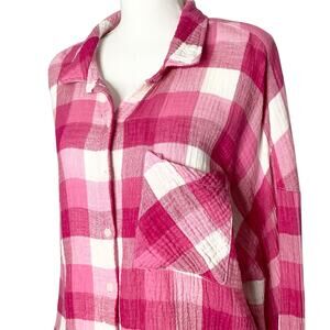 Sanctuary Mod pink and white buffalo plaid check long sleeve button down relaxed fit boyfriend shirt with wide buttoned cuffs and thick gauze fabric