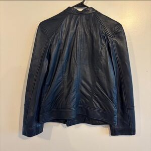 Stylish navy leather jacket with sleek design. Features zippered pockets and asymmetrical front.