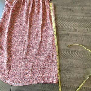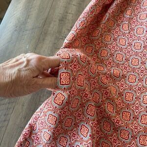 Features: Large ruffle around off shoulder styling. Miniskirt shift. Great burnt orange paisley/geometric print with dusty blue and pink added in. Measurement for length is taken from the bottom of the armhole. Great soft flowy fabric in 100% rayon.