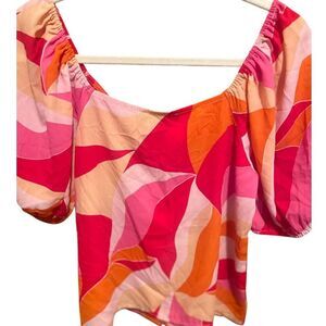 Make a statement in this vibrant abstract wave print blouse. Features romantic puff sleeves, button-down front, and a flattering silhouette in a stunning pink and orange palette. Perfect for summer brunches, office wear with white pants, or dressed up for evening events. The eye-catching wave pattern adds artistic flair to any outfit. New with tags!