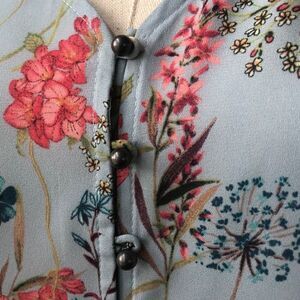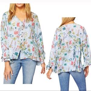 NWOT Sanctuary Posey Floral Blouse Sz S Front button-loop closure Wide V-neck Flouncy sleeves with tiered ruffle cuffs 100% Polyester Front length ~24”, back length ~26” 100% Polyester Machine wash. This beautiful pale, sky blue top features a floral mixture of peonies, anemones, and hollyhock blooms all over. Flowy summer spring prairie cottage peasant western country