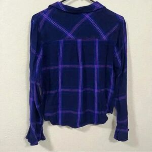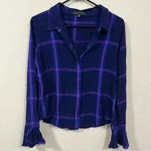Sanctuary Purple Blue Button Down Flannel Shirt Ruffle Sleeves