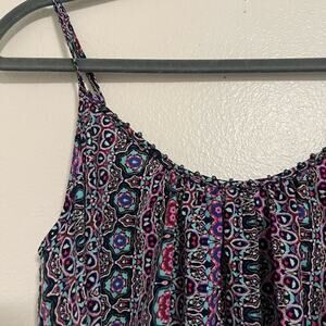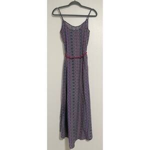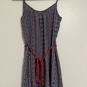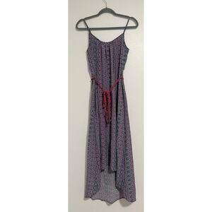 Sanctuary purple printed high low dress with cute pink rope tie in the middle and beading detail at the top! Size tag is missing, it fits me like a medium but please see measurements (pictured). Good, preowned condition!