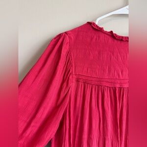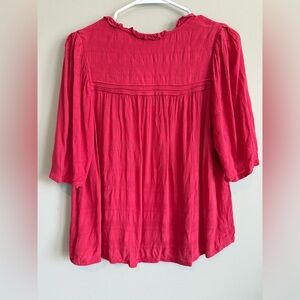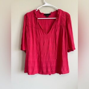 Sanctuary Sweet Memory Top, a flowy 100% rayon shirt featuring a ruffled V-neck and tie details. Soft-flowing raspberry red blouse with a V-neck and subtle ruffle trim. Lightweight fabric with gentle gathers at the shoulders. Three-quarter sleeves and a relaxed hem for easy styling.