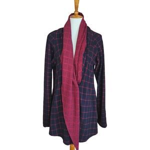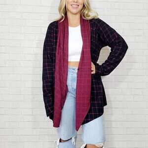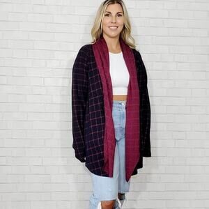 Beautiful navy blue and red checked wrap sweater from Sanctuary. Size medium and in excellent condition. Can be worn a few ways. Measures 32" long, sleeves are 25" and bust is 22"