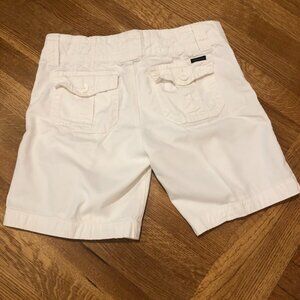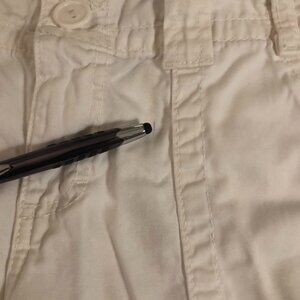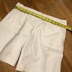 100% Cotton. Designed for everyday occasions, these shorts from Sanctuary are finished with a hem that's easy to roll or unroll for versatile styling. Small mark on front of short but as you can see in pics it's very small and not very noticeable. Flaw reflected in price. THey are in great condition otherwise, just need ironing. :)