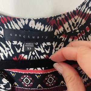 Embrace effortless style with the Sanctuary Sleeveless Black Tribal Chevron Print Split Neck Button Down Tank in XS. This versatile piece effortlessly blends bohemian charm with modern sophistication. The tribal chevron print adds a touch of wanderlust to any ensemble, while the split neck and button-down detail exude casual elegance. Perfect for layering or wearing solo, this tank is a wardrobe essential for the free-spirited fashionista.
