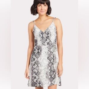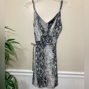 Wrap yourself in the latest trend with this snakeskin print wrap dress. It boasts a classic wrap dress design with the extra flare of the edgy snakeskin print. Spaghetti straps and v-neck front and back give it that feminine styling with a snap closure in front to keep things in place. Wear it to work with a cardigan to cover your shoulders, then transition to drinks after work with the girls with a sexy pair of heels. You're bound to make a statement with this one!