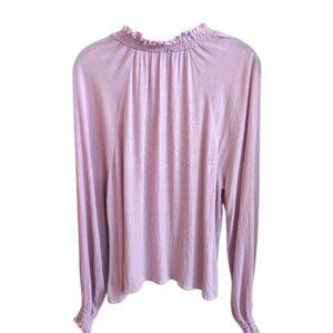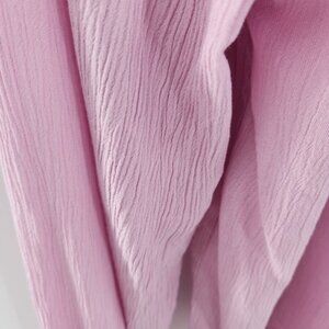 This is a beautiful crinkle gauze blouse. The color is lavender, with a pink hue. This shirt has an open collar with a slight v-neck. There is a smocking detail around the collar as well as the cuffs. The shirt has a relaxed fit, with a straight hem.