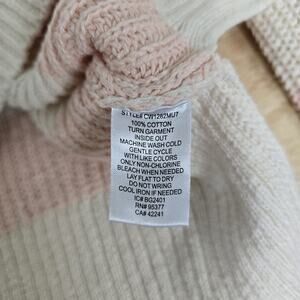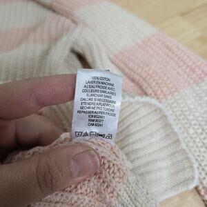 Features a soft, loose-knit texture with wide horizontal stripes in pastel pink and off-white