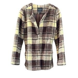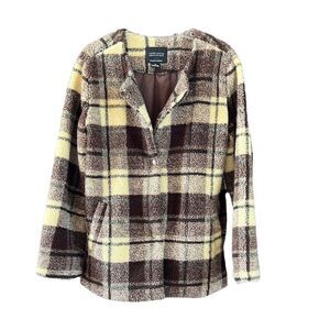 Sherpa Oversized button down buttercream buttercream yellow and brown colored shacket with a full lining. Front pockets with button front.