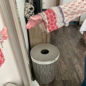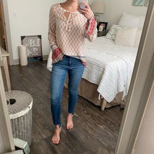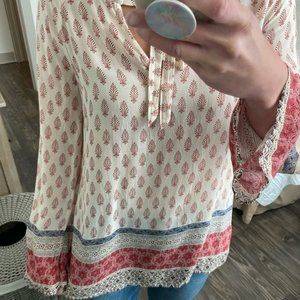 Longer and looser fit. Ties at the neck. Has a slight bell sleeve style. Worn once. In excellent condition.
