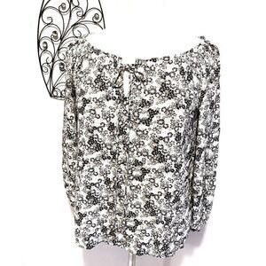 Super cute white colored top with floral pattern in black, peach and blue. Drawstring, rounded neckline. Three quarter sleeve with elastic at hem.