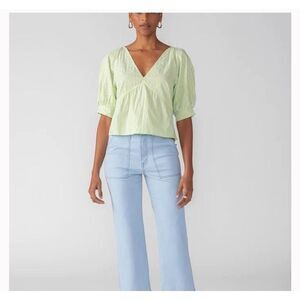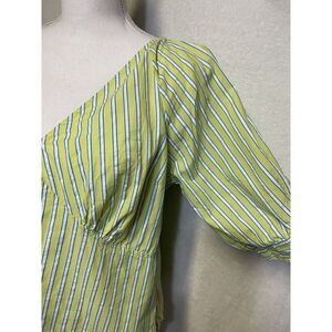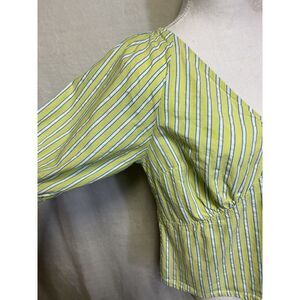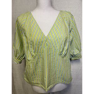 Sanctuary V Neck Cotton Poplin Top in Green Energy Stripe Size L. Green, white, and blue. Pullover with Side zipper closure. Washing washable inside out and tumble dry low, 100% cotton. Preowned in excellent condition.