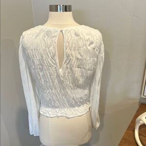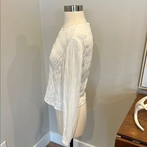 This Sanctuary blouse features a relaxed fit with pleated detailing throughout, offering a soft and flowing texture. The white color and blouse sleeve length make it a versatile addition to any wardrobe, perfect for casual outings or a chic ensemble.