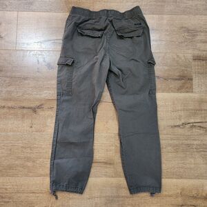 Elevate your casual wardrobe with these green cargo joggers from Sanctuary. The pull-on, drawstring closure, and elastic waist make them comfortable to wear, while the tapered leg style and flat front give them a relaxed fit. These pants are perfect for a casual day out or for running errands, and their minimalist design makes them versatile for any occasion. The leg cuffs have drawcords so you can tighten the bottom leg, giving them a more jogger look. They have two slant front pockets and two side leg cargo pockets. The back pockets are not functional. They are in fantastic condition. Add them to your closet today!