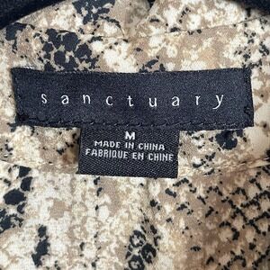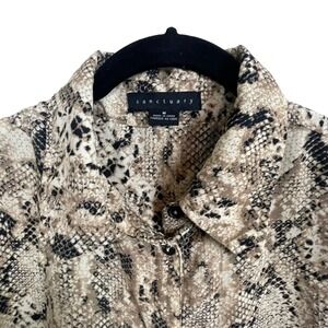 Chic and versatile, this Sanctuary women's size M blouse features a bold snake print design in a lightweight 100% polyester fabric. The boxy fit, short sleeves, and tie-front hem create a flattering modern silhouette, while the button-up style makes it easy to dress up or down. Perfect for work, weekend, or night out.