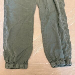 Comfortable olive cargo pants with elastic cuffs. Features drawstring waist and side pockets.