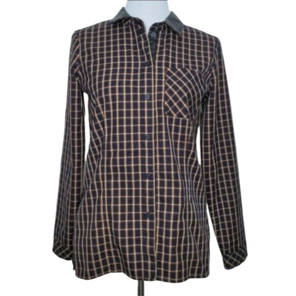 Sanctuary Womens Plaid Shirt Fits Medium Snap Buttons Faux Leather Trim Collar