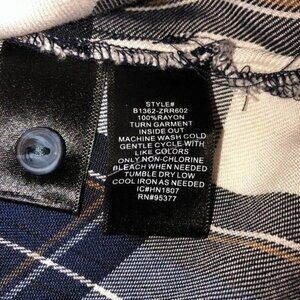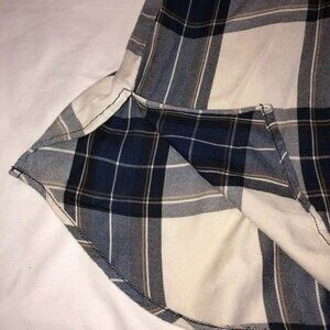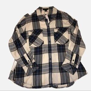 Brand new with tags large blue and tan plaid on a cream background. Size large. Has slits on the side and 2 pockets. Soft cozy rayon. Measurements: armpit to armpit 21”, length 28”, sleeves 24”.