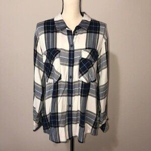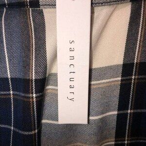 Sanctuary Womens Size L Button Front Tunic Top Blue Cream Plaid Long Sleeve NEW