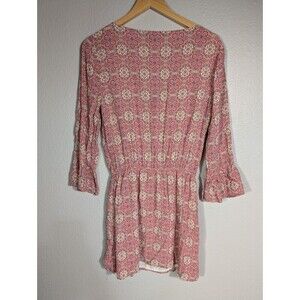 This Sanctuary women's dress features a pretty pink floral print with a drop waist design. It has long sleeves and a tie closure, making it suitable for both party/cocktail and casual occasions. The dress is size small, made of rayon fabric, and is lined for added comfort. The brand is Sanctuary, and the style is a mini dress with a drop waist feature.