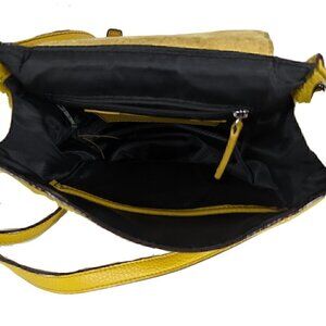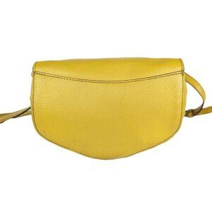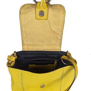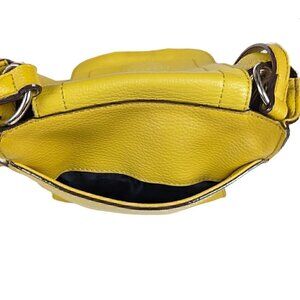 Up to the Minute yellow leather crossbody bag with adjustable strap. Magnetic snap closure with tassel detail. Back pocket and lined interior with pockets. Minor discoloration on inner flap due to use.