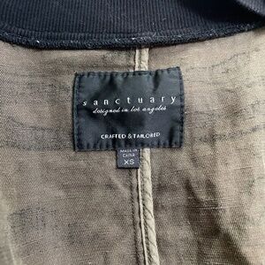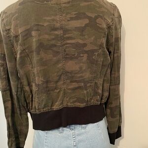 Sanctuary jacket bomber long sleeve camouflage green black womens extra small. Great layering piece. Camo makes a great neutral! Cool zippered pockets on front of jacket and left sleeve. Flattering black trim at waist, wrists, and around neckline.