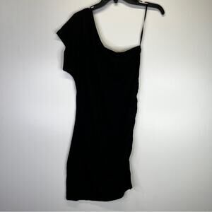 Black one shoulder dress from Sanctuary. Mini length with side scrunching for a flattering fit. Asymmetrical neckline with one shoulder styling. T-shirt material is lightweight with some stretch.