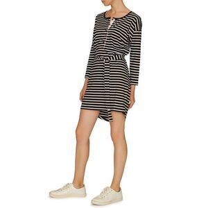 A nautical-striped T-shirt dress is updated in a belted style with twill tape trimming the henley placket.