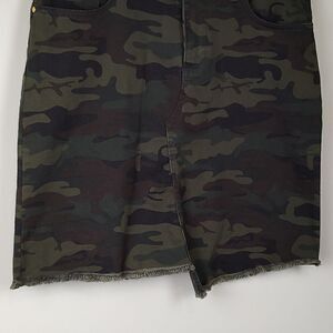 Sanctuary Asymmetrical Frayed Hem Mini Skirt in green camo. This casual skirt features 5-pocket styling with a zipper fly and a gold branded button closure and gold rivets. Super soft 88% cotton, 10% polyester and 2% spandex for a comfortable fit. Size 28.