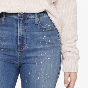 Hand-crafted jeans with a trendy high waist and metallic gold and silver paint print lend artistic style to your casual outfits. Condition is NWOT. Size 29.