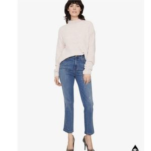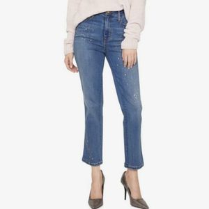 Zip fly with button closure - 5-pocket style - Straight leg - High rise - Faded and whiskered - Metallic paint splatter dots - Denim construction - Cropped - Approx. 11" rise, 26" inseam (size 29) - Imported