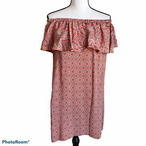 Features: Large ruffle around off shoulder styling. Miniskirt shift. Great burnt orange paisley/geometric print with dusty blue and pink added in. Measurement for length is taken from the bottom of the armhole. Great soft flowy fabric in 100% rayon.