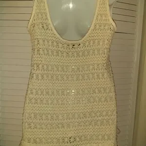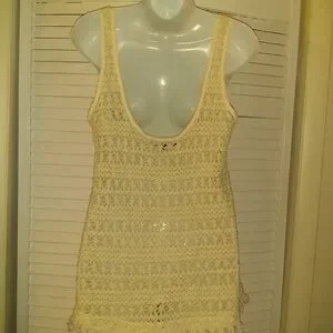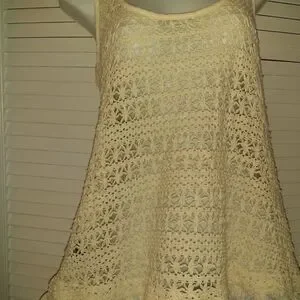 This cream shell is perfect for hot summer days. This open knit sweater shell can be worn with or without a cami under. Fringes at the waist.