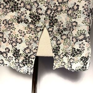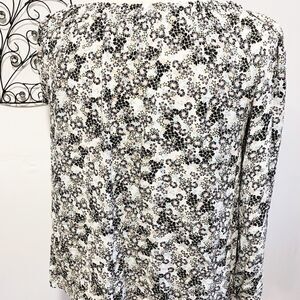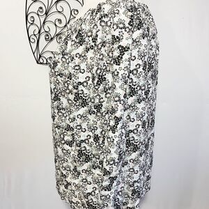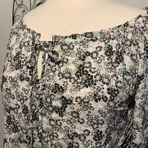 Super cute white colored top with floral pattern in black, peach and blue. Drawstring, rounded neckline. Three quarter sleeve with elastic at hem.