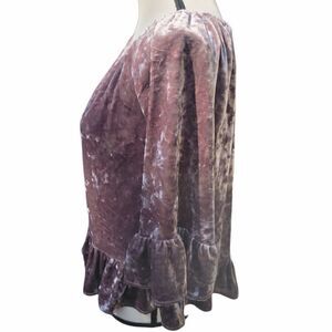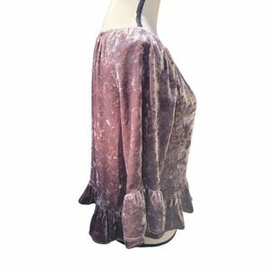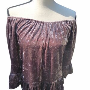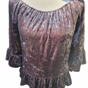 Velvet top with 3/4 bell sleeves. It's like a metallic mauve color. Very pretty. It can be worn on or off the shoulders. In excellent pre-owned condition. Size XS.
