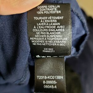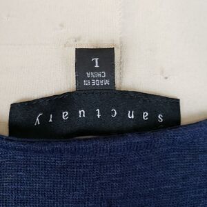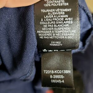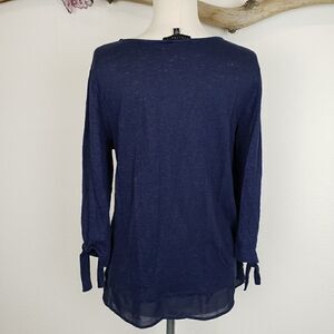 Deep navy blue with a coordinated sheer hem. V neck tunic fit. Cuffs have tie. Lightweight burnout semi sheer sweater