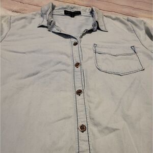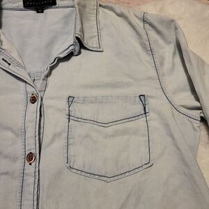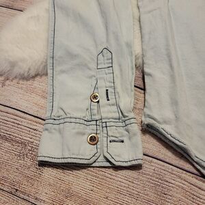 Sanctuary light blue button-down collard long-sleeved top, size XS, 1 open pocket over front left bust, 2 button closure cuffs, slight raw hem, 100% cotton, pre-shrunk, excellent condition.