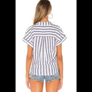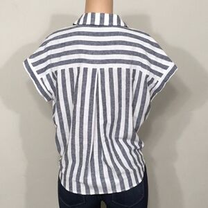 New. Sanctuary cuffed dolman sleeve navy stripe top. Linen/cotton blend. Draw string in the front lint in the back. Button up front with collar.