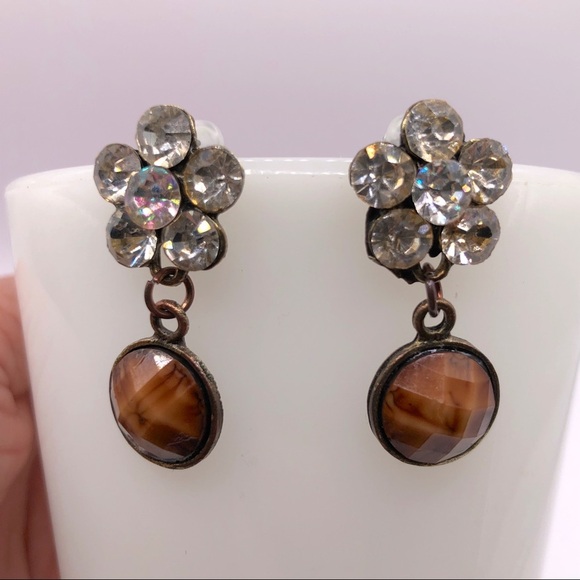 Thee pre-owned earrings are in great shape. They have new backings. They have sand colored rhinestones, plastic decal, and bronze tone metal casing.